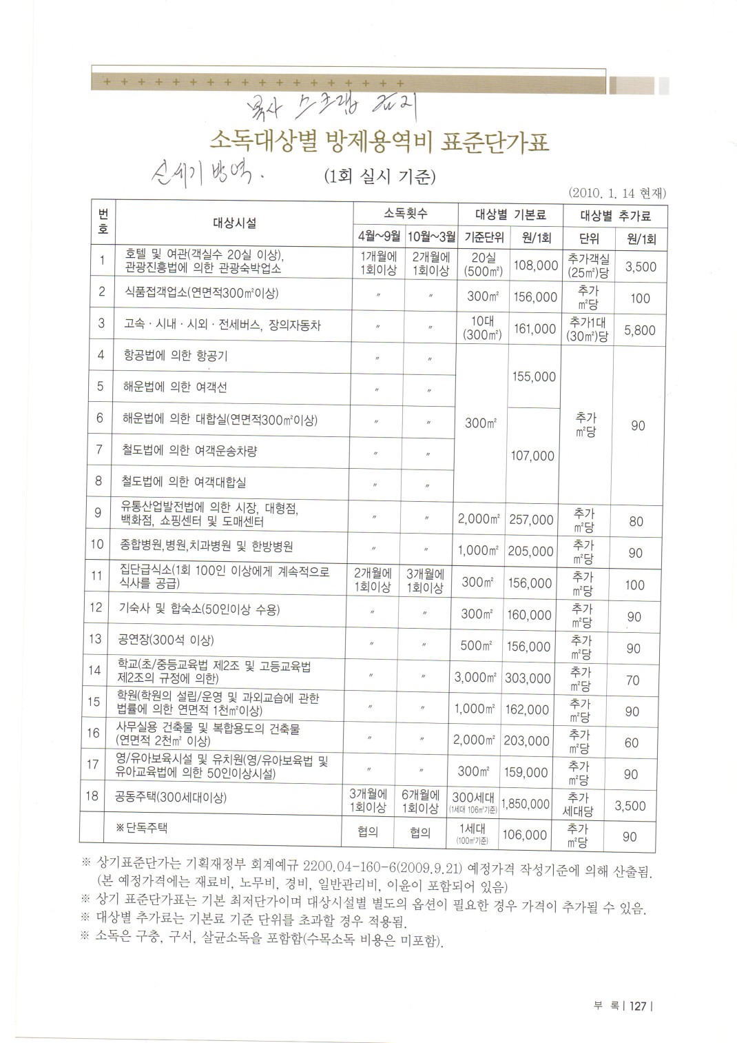 소독대상별방제용역비표준단가표